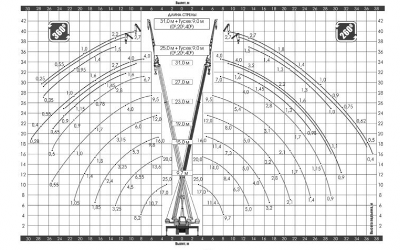 Описание комплектации а/м г/п 25 т, длина стрелы 28 м, гусек 9 м